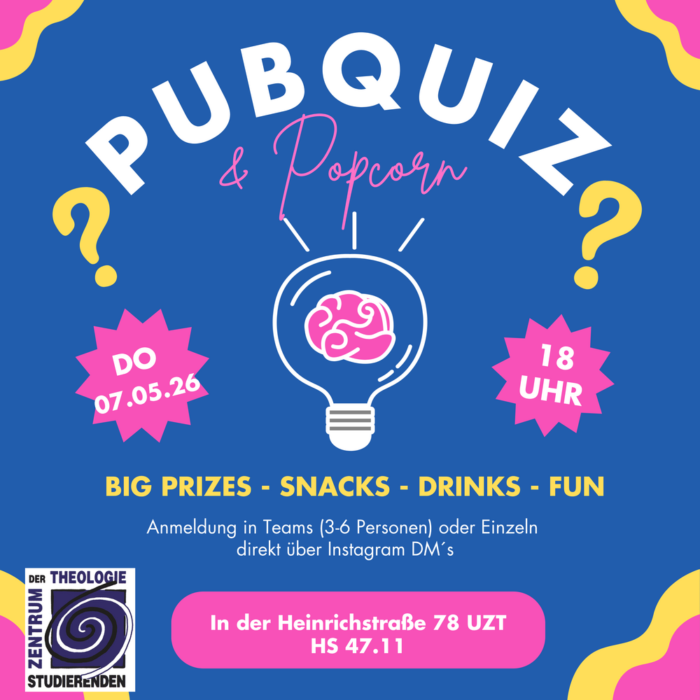 Wir laden auch heuer recht herzlich zum Pubquiz am Do, 7. Mai ein. Um 18 Uhr starten wir im Fakultätsgebäude (Heinrichstraße 78, HS 47.11).