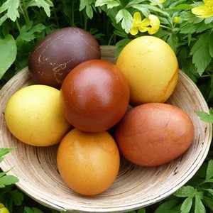 Durch Sprünge gelangt die Eierfarbe oft aufs Ei. Bei Naturfarben ist das kein Problem, diese Farben können Sie einfach mitessen. Von uns bekommen Sie einfache Anleitungen zum Färben und außerdem Rezepte fürs Kochen nach dem Eierpecken. Zwiebelschalen lassen Eier erröten, Curcuma taucht sie in sattes Gelb, Holunderbeeren färben schokobraun und Brennnesseln grün.