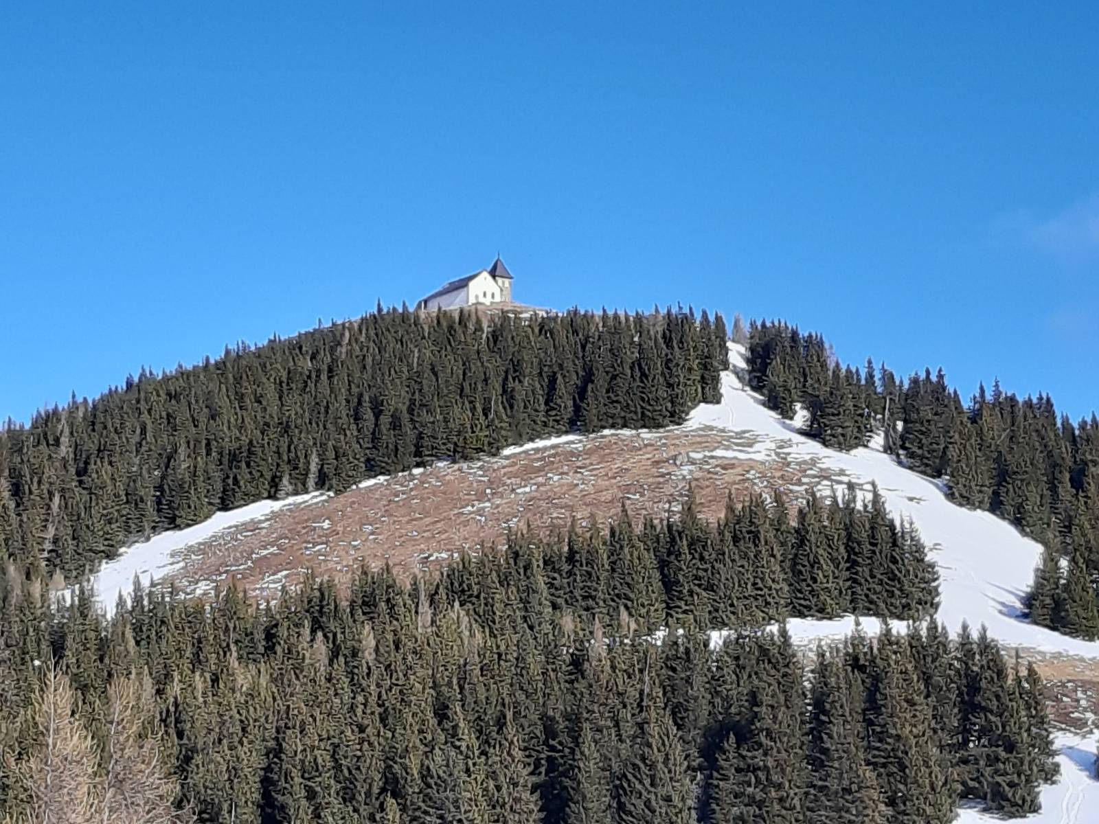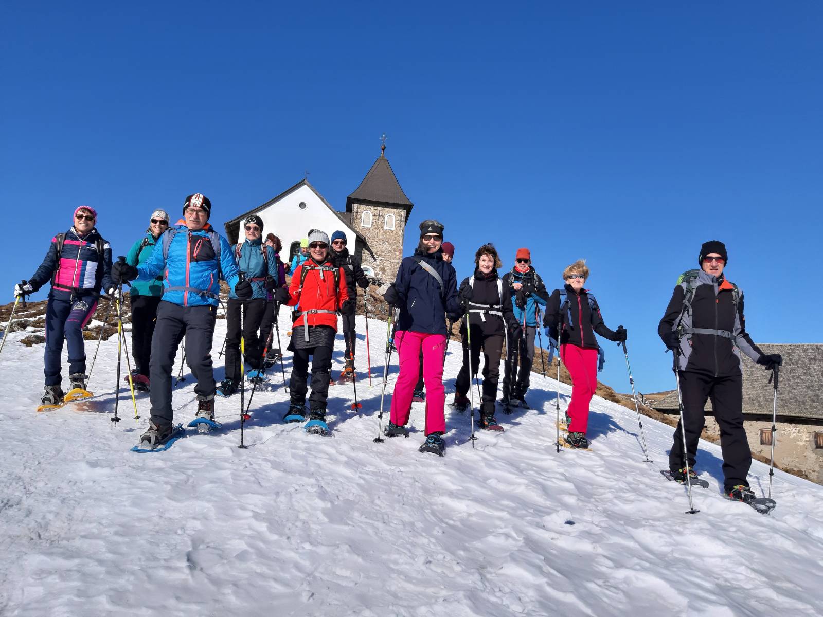 Ziemlich genau um 12Uhr erreichten wir Maria Schnee. Der Blick von oben auf die verschneiten Berge bei herrlichem Sonnenschein war fantastisch. Nach verdienter Stärkung begaben wir uns in das Kirchlein. Wir bildeten einen Kreis. A.Jokesch hielt eine stimmungsvolle Andacht. Wir sangen und beteten gemeinsam. Es war sehr frisch in der Kirche. Umso schneller liefen wir mit unseren Schneeschuhen die unverspurten Tiefschneehänge hinunter. Fast bei den Autos angekommen, versuchten wir uns noch einmal im Singen (das Kanonsingen muss noch geübt werden!). Nach gemeinsamem Essen in Traboch traten wir die Heimfahrt an.