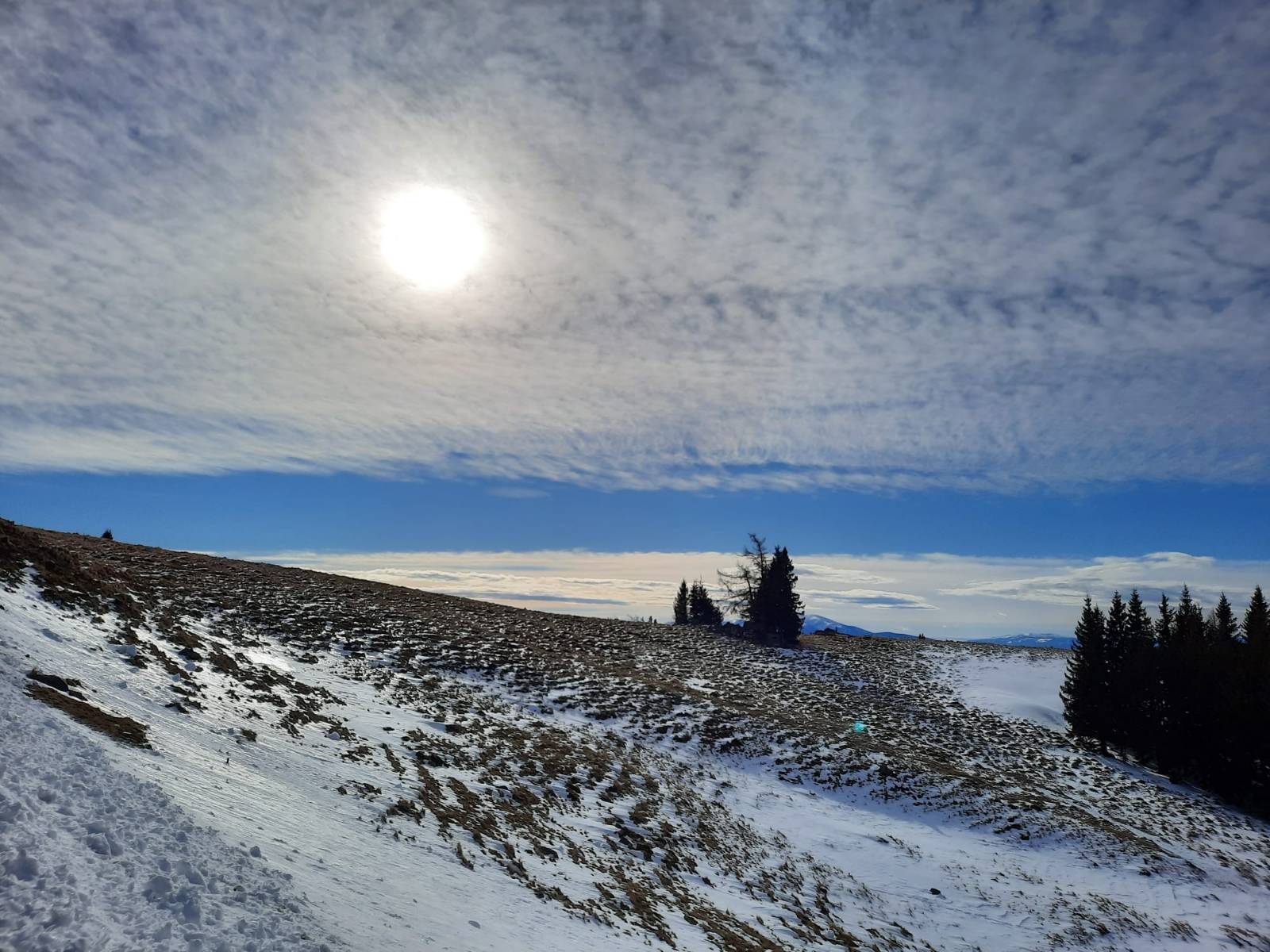 Nach erfolgter Anreise starteten wir beim Kühbergerhof mit gemeinsam gesungenen Liedern (Noten v. M.H.) und dem Segen von A. Jokesch. Margit Hirtzi spurte, Franz Hirtzi bildete das Schlusslicht. Wir wanderten auf Forstwegen, durch Wald und Wiesen, fast immer gut verschneit. Auch das Wetter wurde immer schöner.