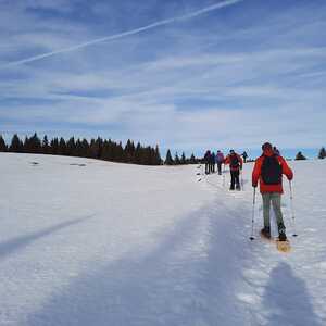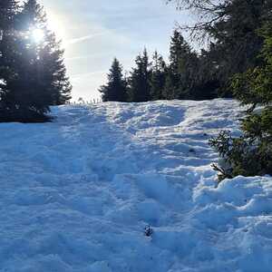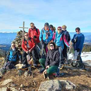 Nach einer Stunde konnten wir dann die Schneeschuhe anschnallen; am Wildbachsattel legten wir eine kurze Pause ein bevor wir die letzten 200 Höhenmeter Richtung Weberkogel in Angriff nahmen. Am Weberkogel mit den kleinen Gipfelkreuz verweilten wir - trotz herrlicher Fernsicht - nicht sehr lange, da es sehr windig war. Der Rückweg führte uns wieder zum Wildbachsattel, von hier marschierten wir dann Richtung Nordwesten, vorbei am Wolfstein Richtung Bärofen. Vor dem Bärofen überquerten wir eine große Almwiese Richtung Osten und durch den Wald ging es wieder zurück zur Rehbockhütte.