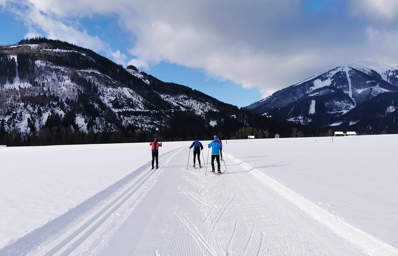 Fast pünktlich zu Beginn unserer Langlauftage ist der Winter eingebrochen und hat große Mengen an Neuschnee für das Wochenende gebracht. Der starke Schneefall hat uns aber nicht davon abbringen lassen, einige Loipenkilometer zu sammeln. Zum krönenden Abschluss hat sich am Sonntag dann doch noch die Sonne gezeigt und wir konnten neben den perfekt präparierten Loipen auch noch das Panorama der Haller Mauern und der Reichensteingruppe genießen.