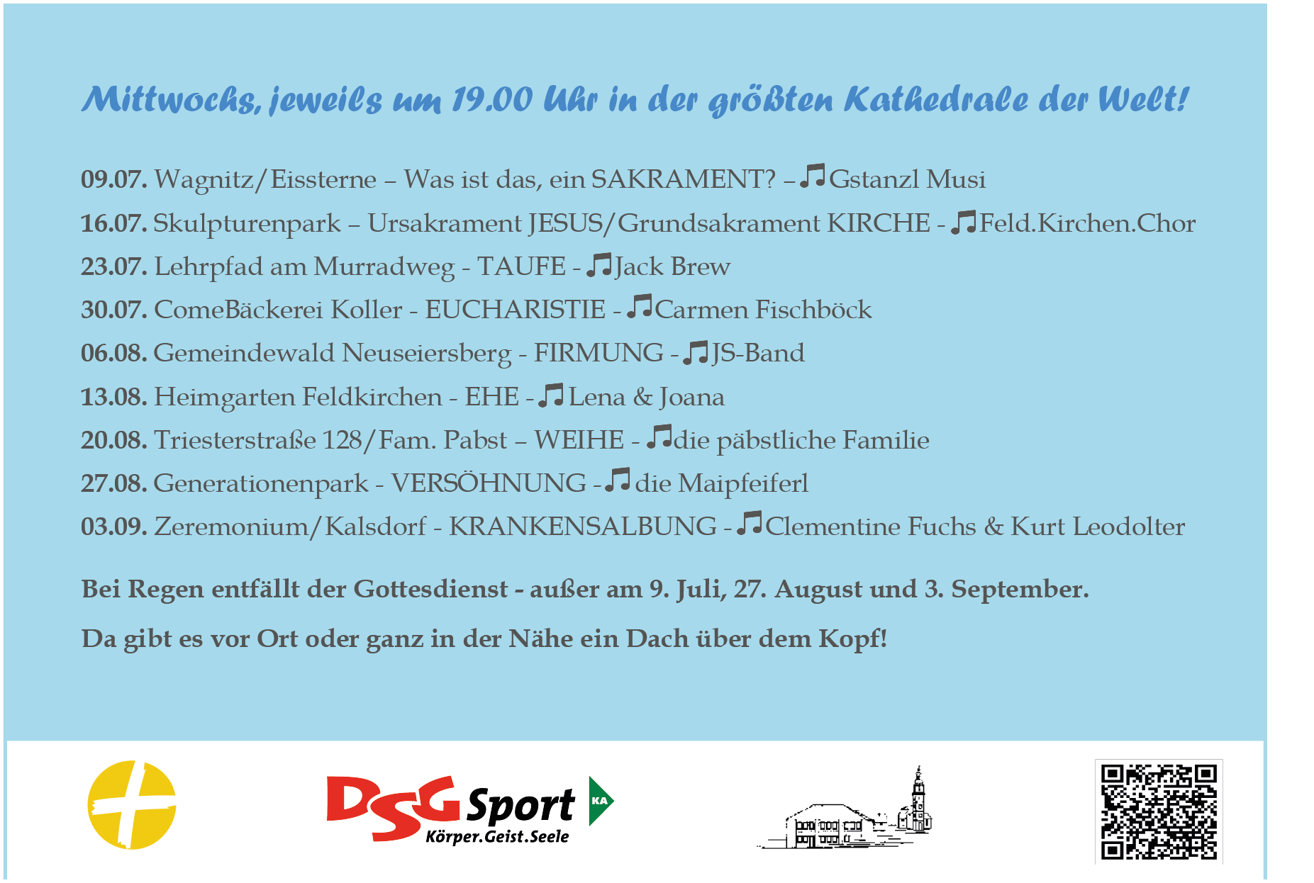Im Heiligen Jahr 2025 lade ich ein, dass wir uns mit den Sakramenten der Kirche auseinandersetzen. Sie begleiten uns ja unser ganzes Leben lang. Die Outdoor-Gottesdienste sind eine Chance zur Besinnung und für das Miteinander - aber auch eine gesunde Unterbrechung des Alltags. Sie sind eine Gelegenheit mitten in der Woche bewegt zur Mitte zu finden. Das Hinausgehen in die Natur, das Innehalten und Hören, Musik und Gesang, aber genauso das Nachdenken über die Hoffnungszeichen der Kirche können dafür eine Hilfe sein.