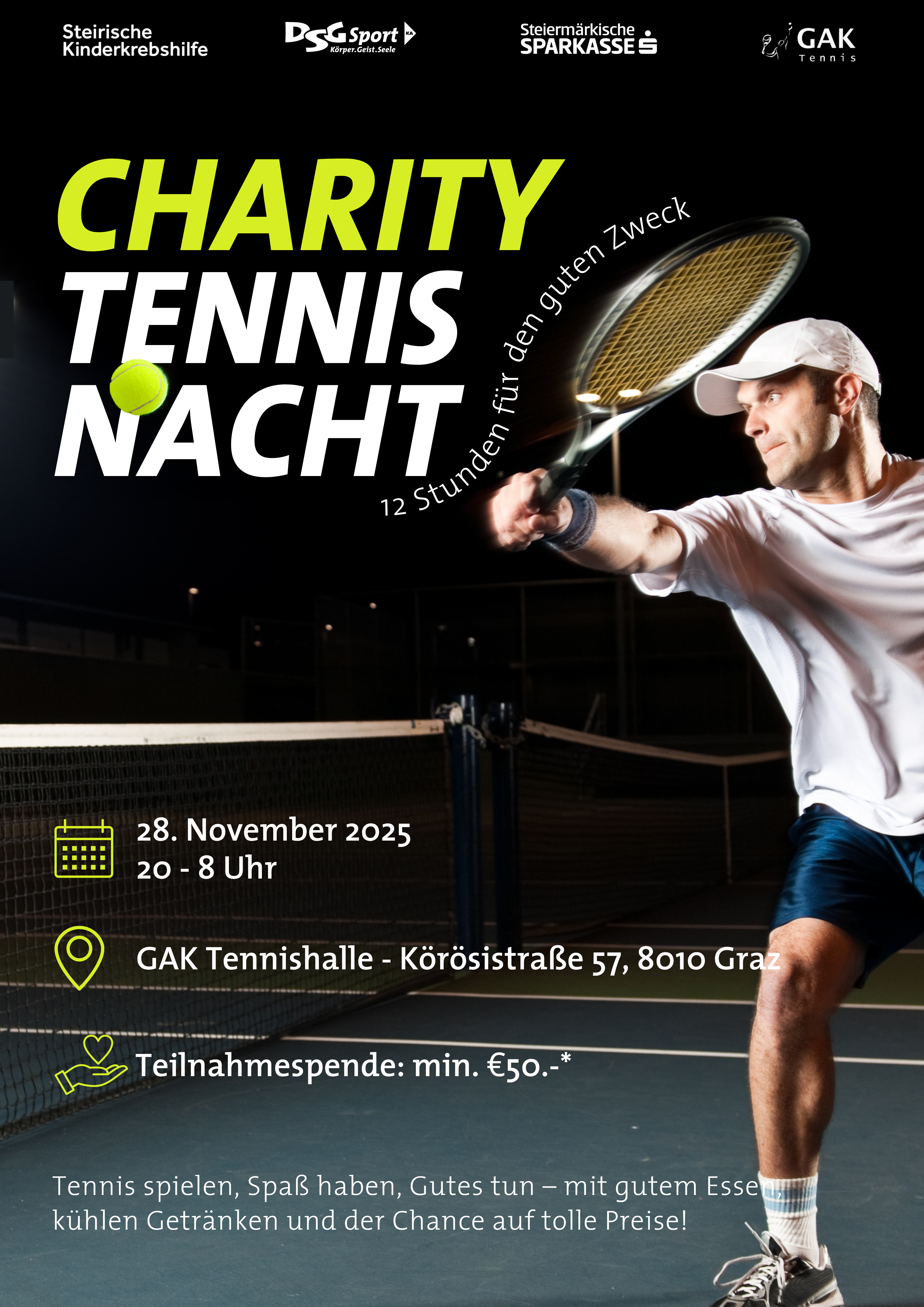 Am 28. November 2025 findet die Charity-Tennis-Nacht in der Halle auf dem GAK-Tennis-Areal (Körösistraße 57, 8010 Graz) statt und du bist herzlich eingeladen!