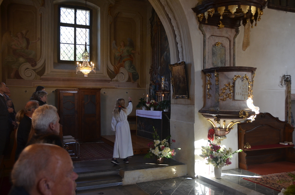 Bei der Allerheiligenlitanei wurden die Heiligen unserer Filialkirche angerufen, wobei die Ministranten auf ihr Bild dabei zeigten.