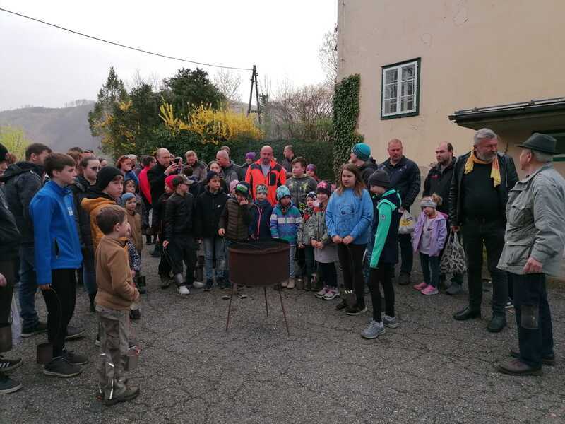 Am Karsamstag begannen Fritz Oswald und Franz Haselbacher wieder kurz nach 06.00 Uhr in der Früh mit dem Feuer machen am Kirchberg. Nach der Segnung des Feuers durch Herrn Pfarrer Dr. Hüttl wurden die Glutstücke in die Blechdosen der vielen Kinder verteilt, um die getrockneten Holzschwämme zum Glimmen zu bringen.
