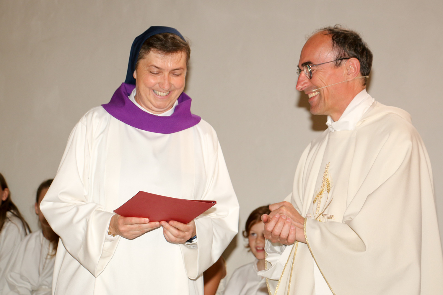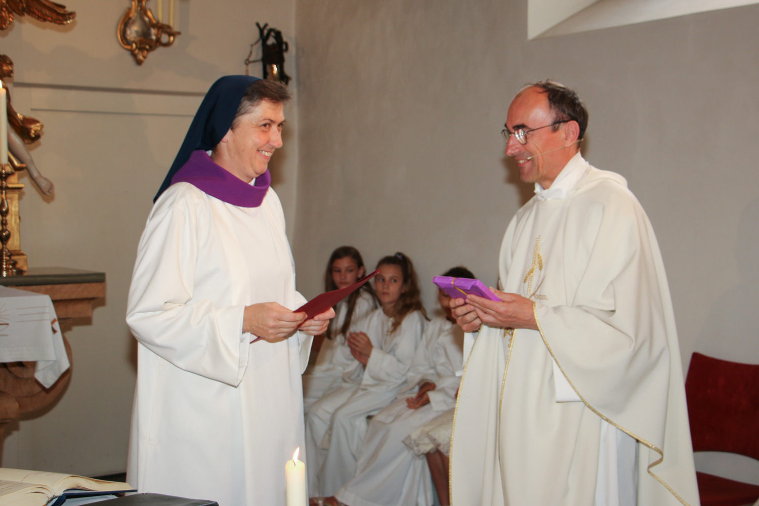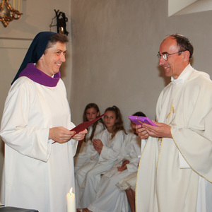 Und auch Sr. Maria beginnt einen neuen Dienst: Sie wurde nach einer Ausbildung vom Bischof als Begräbnisleiterin in die Pfarre gesendet und bekam von Pfarrer Hans Karner das Dekret dafür im heutigen Gottesdienst überreicht. Dabei trug sie eine weiße Albe mit einem violetten Kragen, wie es für Begräbnisleiterinnen vorgesehen ist.