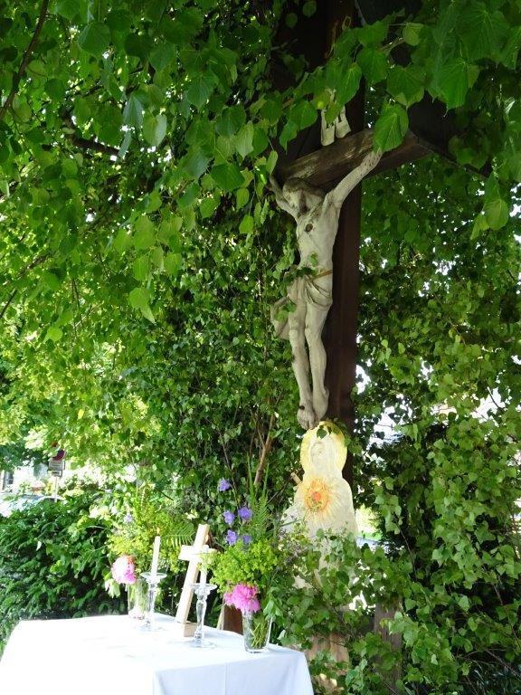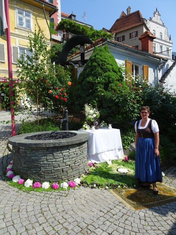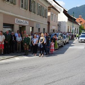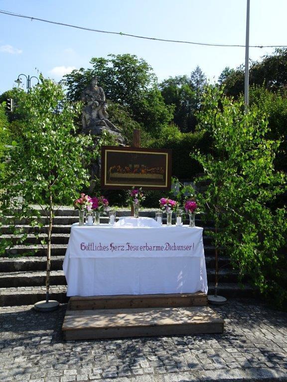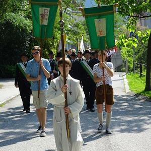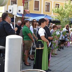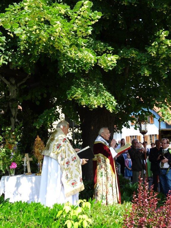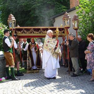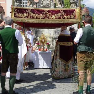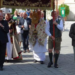 Am Beginn des Fronleichnamsfestes, dem "Hochfest des Leibes und Blutes Christi" stand ein festlicher Gottesdienst in der Pfarrkirche, zelebriert von Franziskanerpater Bernardin Schröder und  Pater Simon. Hernach folgte die feierliche Prozession mit einer Monstranz (Gefäß, in dem eine Hostie für den Leib Christi aufbewahrt ist) unter einem Baldachin zu den Stationen mit den liebevoll geschmückten 4 Altären im Römerpark, Vormarkt (Missionskreuz), am Taboraufgang und bei der Mariensäule am Hauptplatz, wo jeweils die Evangelien gelesen und der eucharistische Segen erteilt wurde.