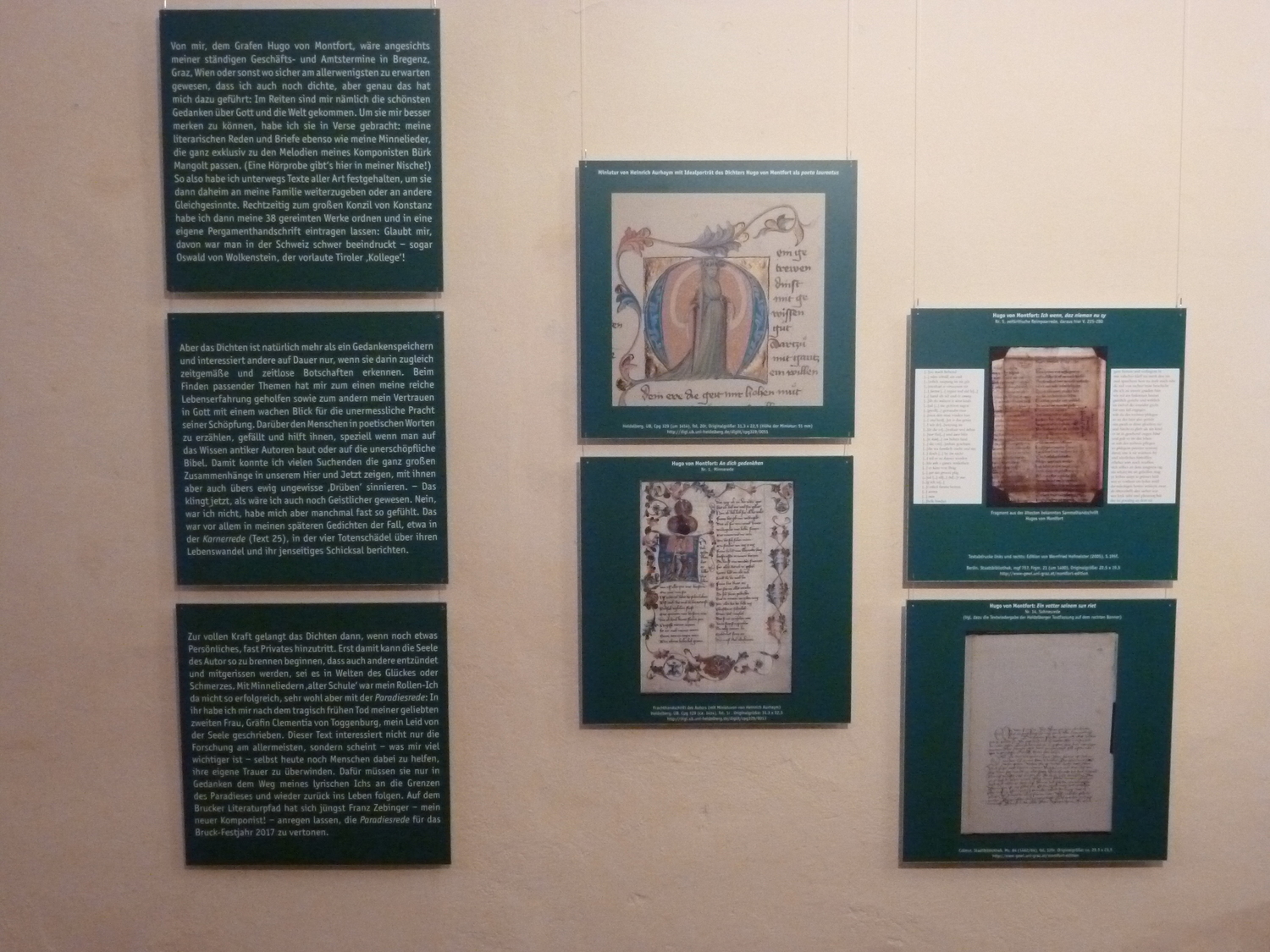 Vermutlich um 1414 – also auf dem Höhepunkt seiner Macht – ließ Graf Hugo von Montfort in Wien oder in der Steiermark jene Prachthandschrift seiner poetischen Werke anfertigen, die in der Heidelberger Universitätsbib­liothek liegt: 40 Dichtungen in frühneu­hochdeutscher, stark alemannisch gefärbter Sprache überliefert diese z.T. bebilderte und mit 10 Notenaufzeich­nungen versehene Handschrift, aber nur die ersten 38 Texte dürften tatsäch­lich von Hugo stammen, denn Nr. 39 und 40 wurden erst nach seinem Tod eingetragen und weisen auf eine fremde Autorschaft hin. In den ersten 38, sicher ‘echten’ Hugo-Texten begegnet uns (in Form poetischer Reden, Briefe und Lie­der) ein tief gläubiger, geradliniger Mensch, der sich von hohen morali­schen Idealen beseelt zeigt und neben aller Lebensfreude auch bedrückende Erfahrungen mit Leid und Tod reflek­tiert.