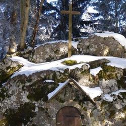Im Zentrum der Felsnische befindet sich hinter einem schmiedeeisernen, verschließbaren Gitter ein Kruzifix, eine Darstellung des ans Kreuz genagelten Christus, dem Sinnbild für das Opfer Christi, das er zur Erlösung der Menschheit gebracht hat.