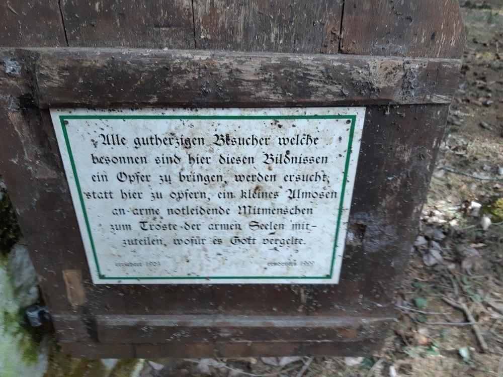 „Alle gutherzigen Besucher, welche besonnen sind, hier diesen Bildnissen ein Opfer zu bringen, werden ersucht, statt hier zu opfern, ein kleines Almosen an arme notleidende Mitmenschen zum Troste der armen Seelen mitzuteilen, wofür es Gott vergelte.“