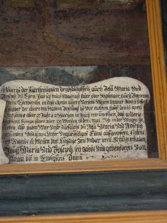 Links daneben ist ein Votivbild vom „Heiligen Wandel“, ein Bildmotiv der sakralen Kunst, das die Heilige Familie als Gehende darstellt. Datiert ist dieses Bild mit 1709 und zeigt im linken unteren Bildrand den Schweizerhof in Laufnitzdorf. Der Spender des Gemäldes, Matthias Auer vulgo Rigelmair, beklagt den Tod seiner zwei lieben Kinder Johannes – er ist im dritten Lebensjahr im Bach ertrunken – und Simon, der im Alter von 29 Wochen verstorben ist , und erbittet zukünftig den Schutz der Heiligen Familie.