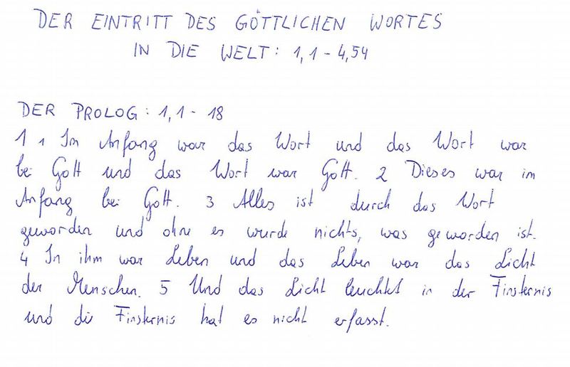 Alle Teilnehmenden erhalten einen Leitfaden, die Textpassage aus einem der vier Evangelien, die per Hand abgeschrieben werden soll, einen Linienspiegel sowie ausreichend Papier, auf das die jeweilige Textpassage per Hand geschrieben werden soll.