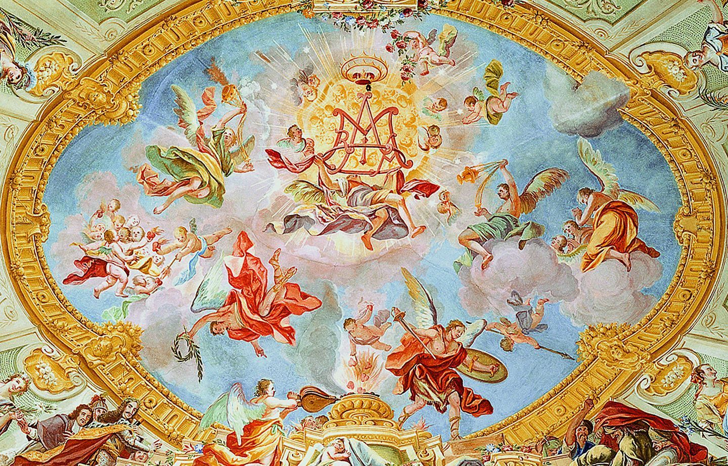 Wir treten durch das schöne Portal in die Kirche ein. Der Raum ist groß und eindrucksvoll. Die ganze Schönheit ist auf den Hochaltar verwendet und auch die Fresken geben der Kirche ihren prunkvollen Ausdruck.
