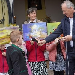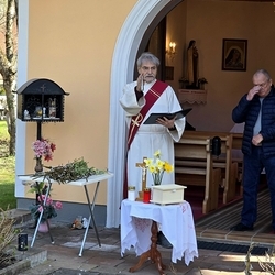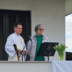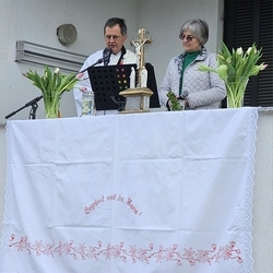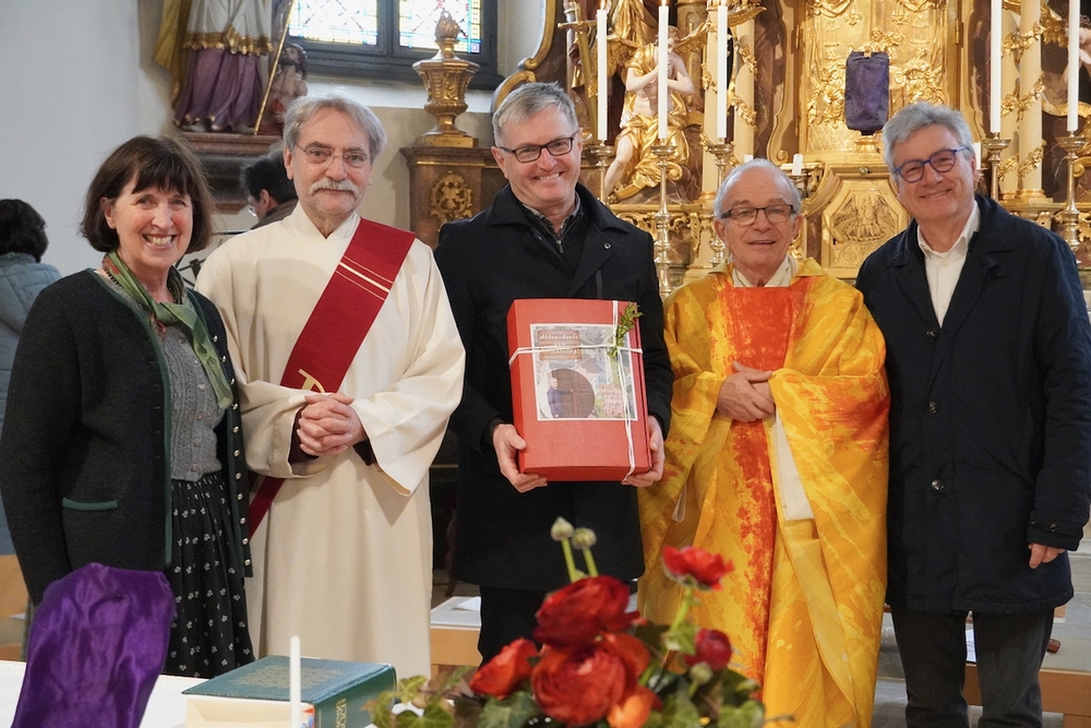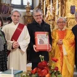 Vor dem Schlusssegen überreichte Ernst Pock im Namen der Pfarre dem neuen Diakon ein Aspergill, mit dem dieser gleich voll Freude die Gläubigen segnete. Für seine Ehefrau Eva, die ihm begleitend zur Seite steht, gab es einen Blumenstrauß, mit den besten Wünschen für sie.