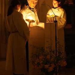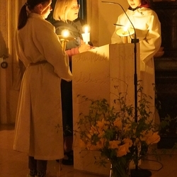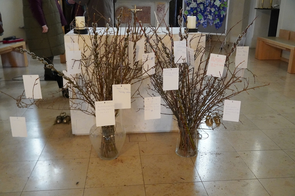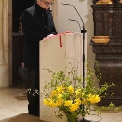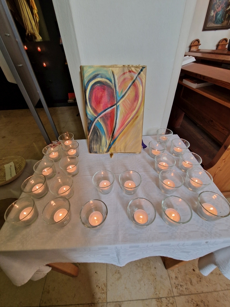 Vor dem Altar brannten 59 Teelichter für alle Menschen, die im letzten Jahr in unserer Pfarre verstorben sind. Ihre Namen wurden noch einmal laut ausgesprochen. Ein Teelicht leuchtete für alle Verstorbenen, die ungenannt blieben.