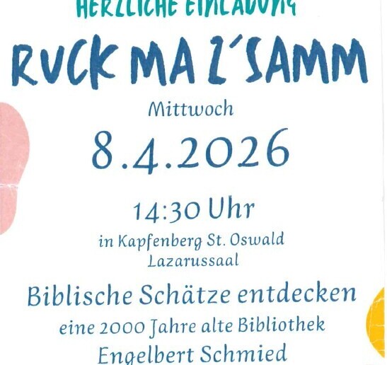 Die Pfarre St. Oswald lädt sehr herzlich zum Ruck ma z`samm am Mittwoch, den 8. April, um 14:30 Uhr im Lazarus-Saal in St. Oswald ein.